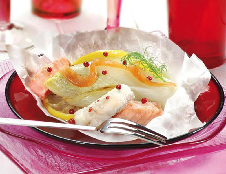 5. Pour chacune des 4 papillotes : disposez sur une feuille de papier sulfurisé légèrement huilé quelques tranches de citron, une endive et quelques morceaux de lotte et de saumon.